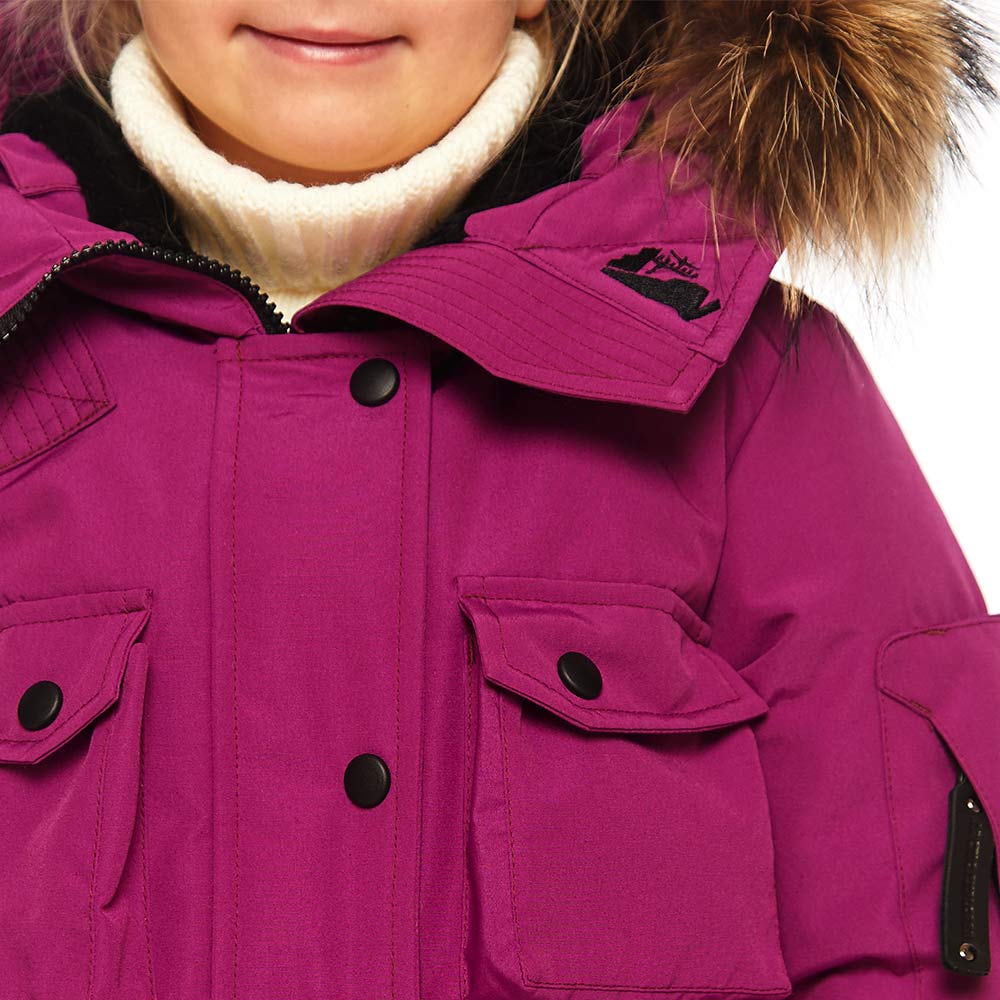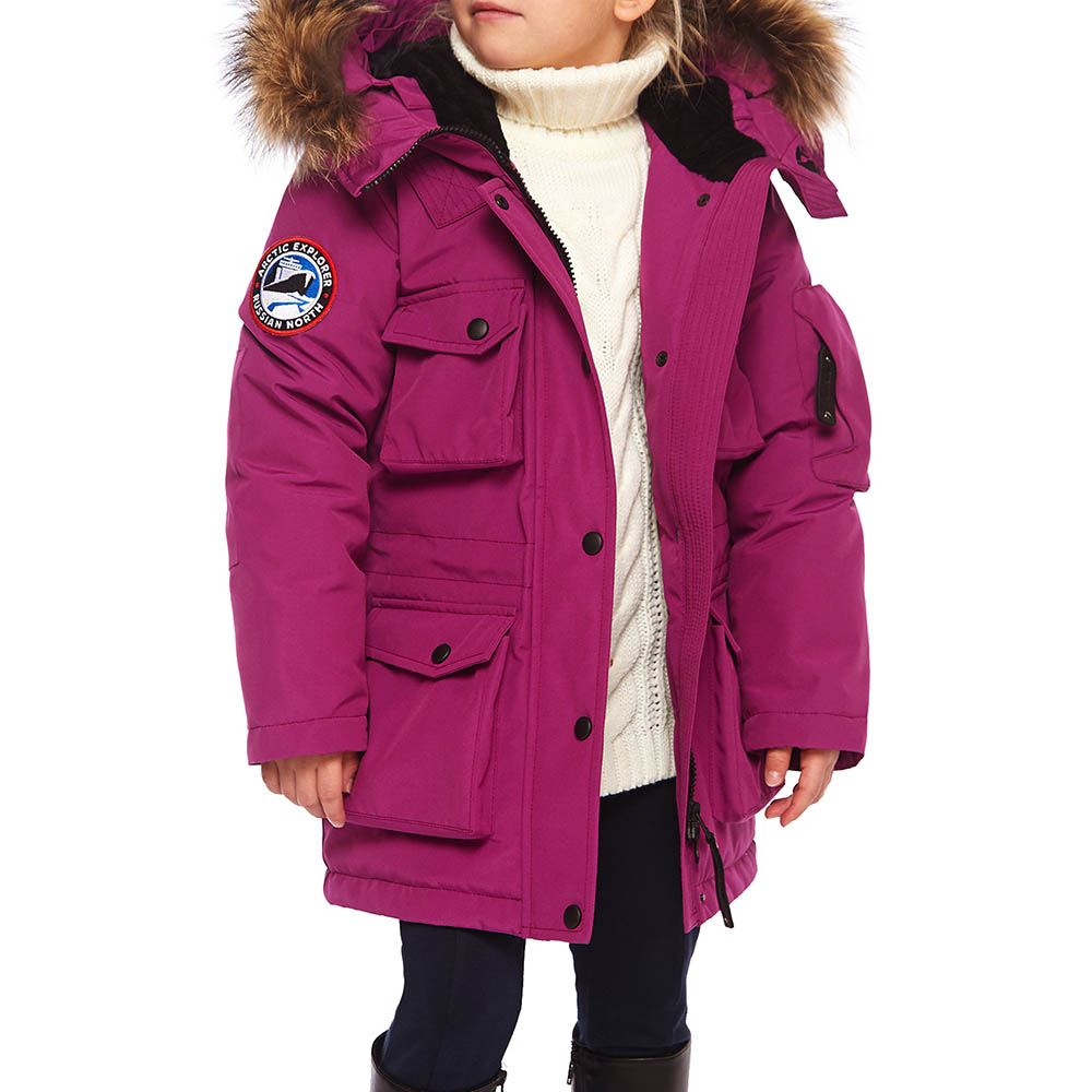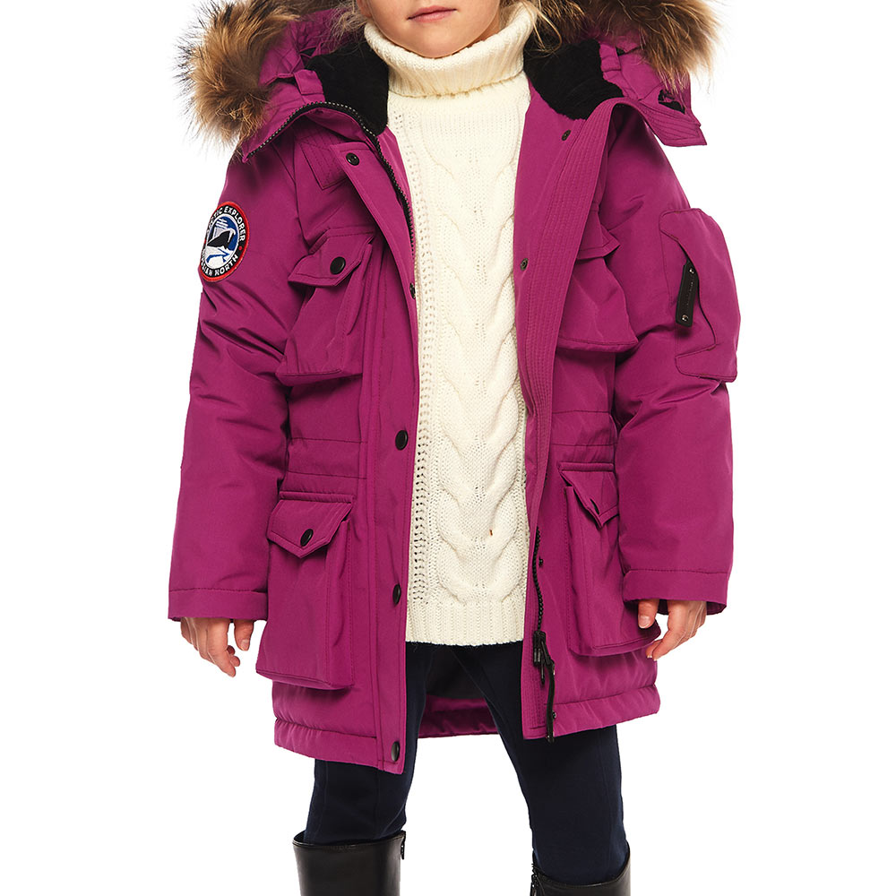 Это детская версия женской парки UMI, такая же качественная и теплая, утеплитель из гусиного пуха; утепленные внешние карманы; накладной карман на рукаве; внутренние теплые манжеты; капюшон-труба с опушкой из натурального меха енота (отстегивается); погон на одном плече – реплика на полярные погоны. А также еще немного о деталях: